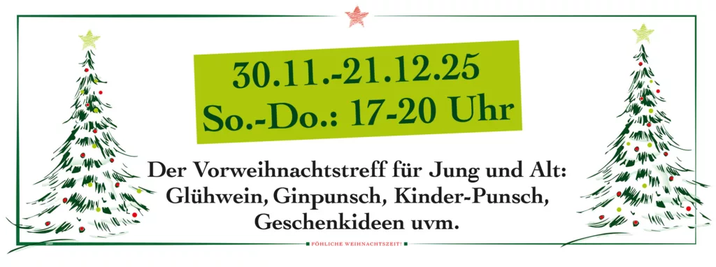 Natürlich bieten wir an unserem weihnachtlichen Stand noch mehr an als einfach nur köstlichen Glühwein: Außerdem stehen Kinder-Punsch, Ginpunsch und Weihnachtsbier auf der Karte. Selbstverständlich ist auch für kleine süße und Herzhafte Snacks gesorgt; sie ergänzen das Angebot.